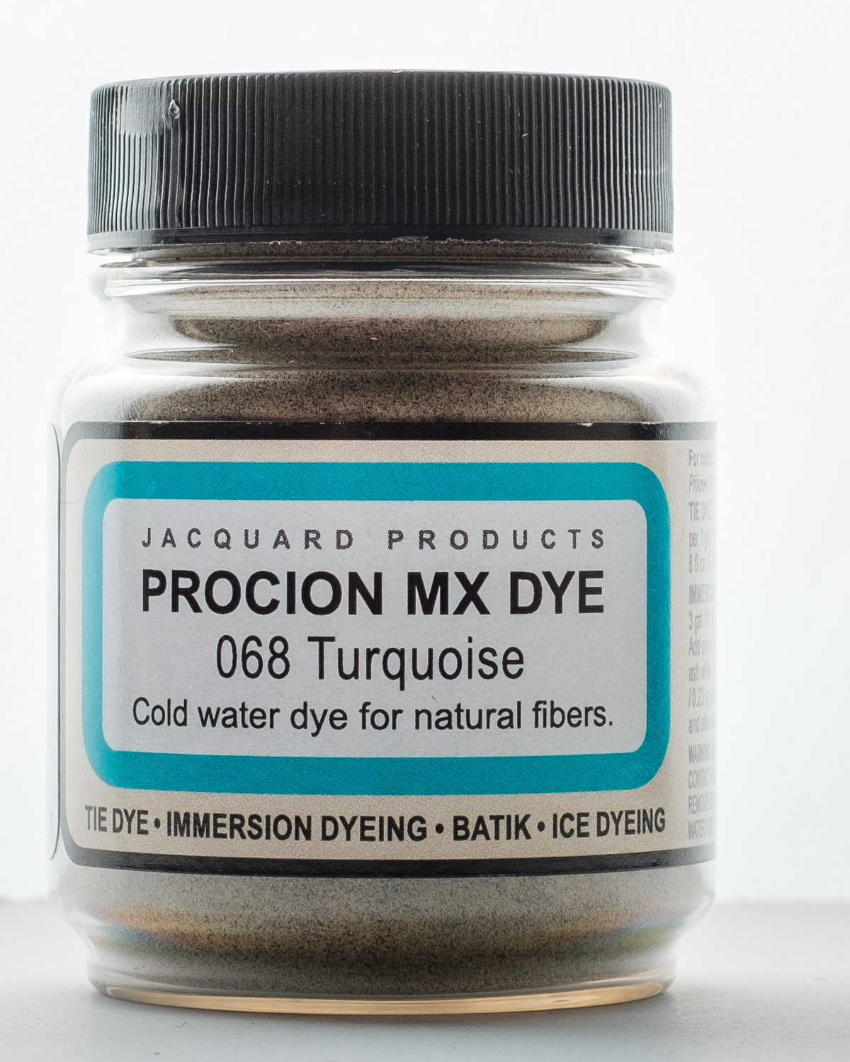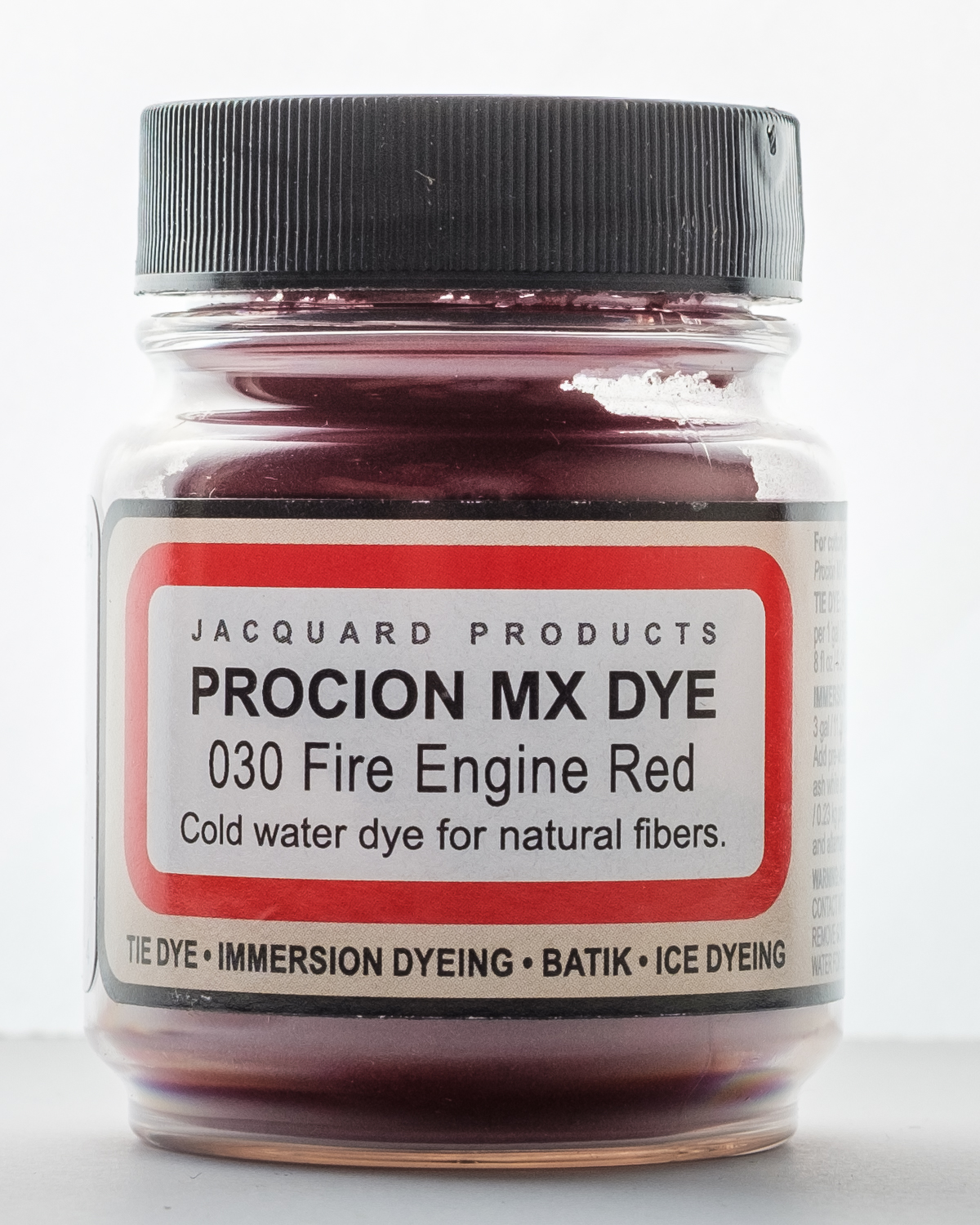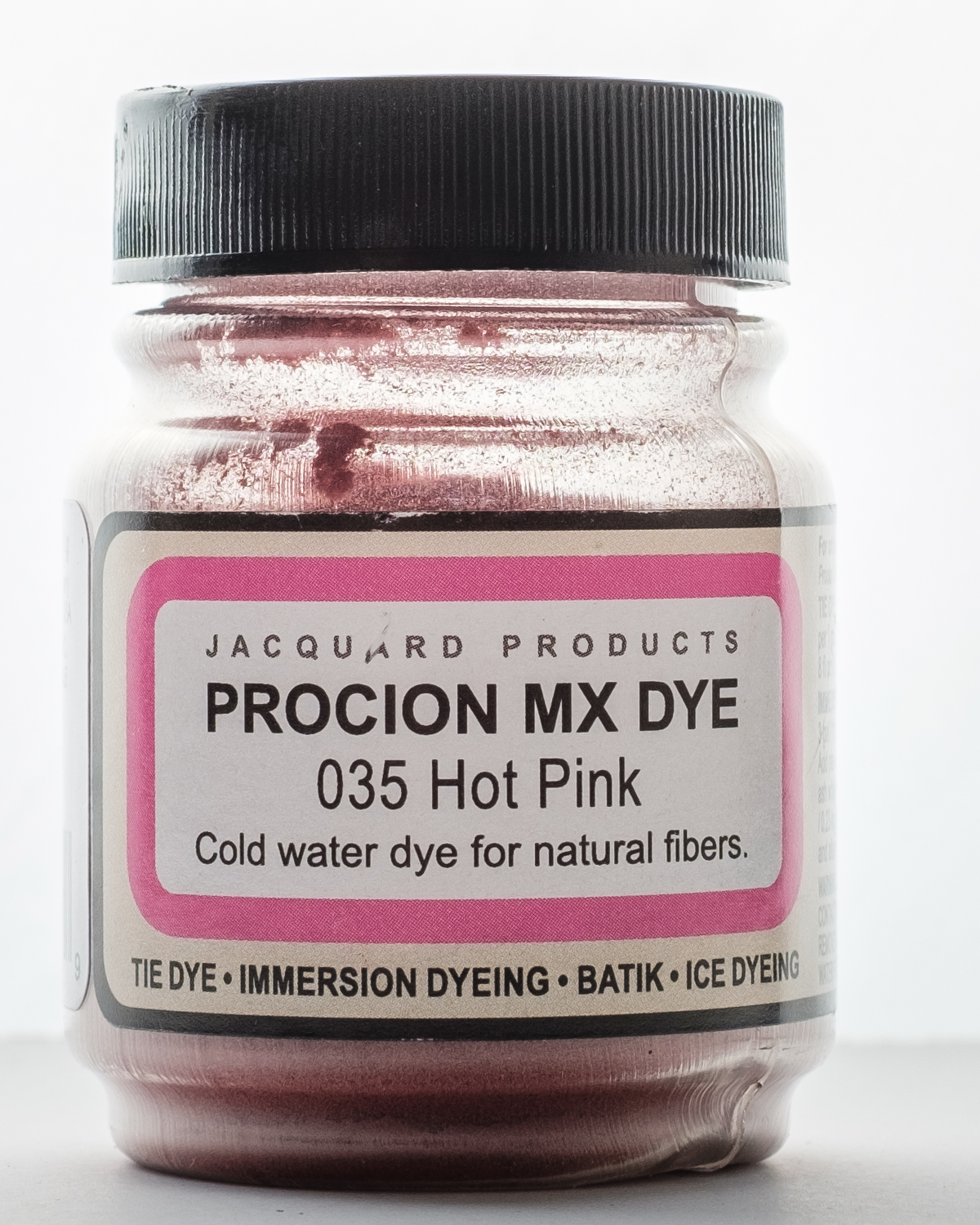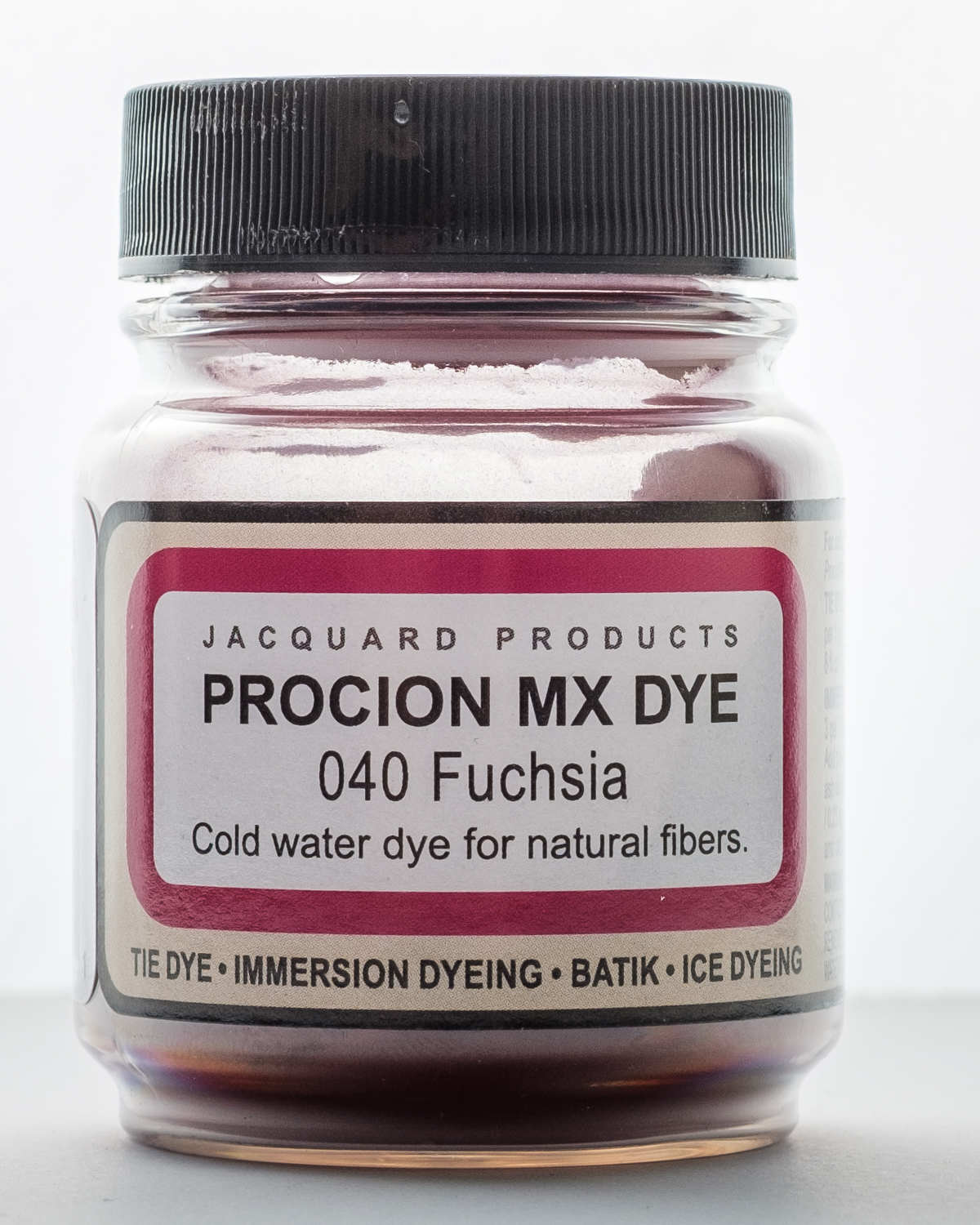 Use this dye for immersion dyeing, tie dye, batik, airbrushing, garment dyeing, screen printing, spatter painting gradation dyeing and more! It is a cold water fiber reactive dye, when added to tap water it is the most vivid of all dyes for cellulose fibers. It will dye all cellulose and some protein fibers. This package contains a 2/3oz jar of dye. Powder solution changes color when adding water. Final result matches bottle label. Available in a variety of colors, each sold separately. Conforms to ASTM D 4236. Made in USA.