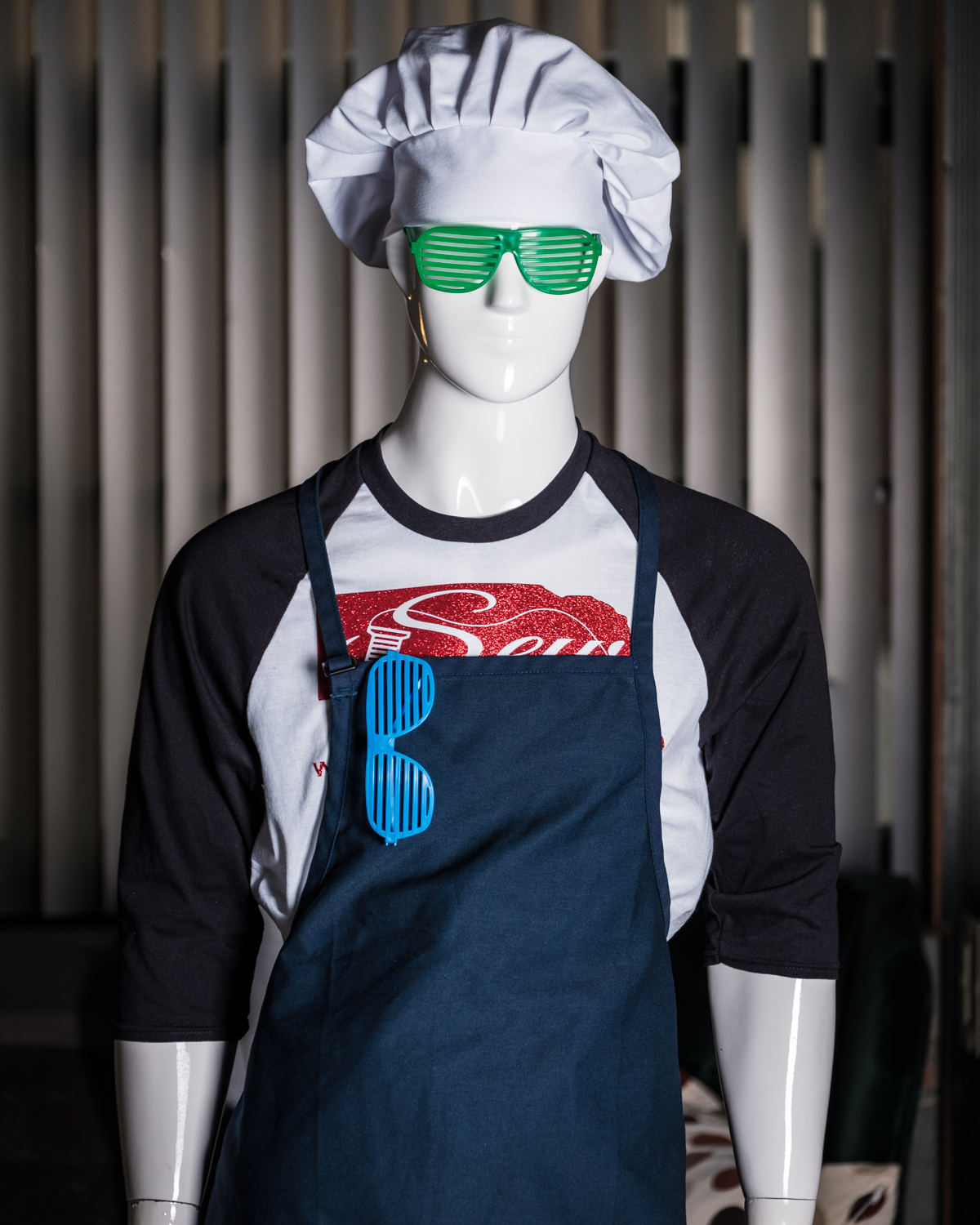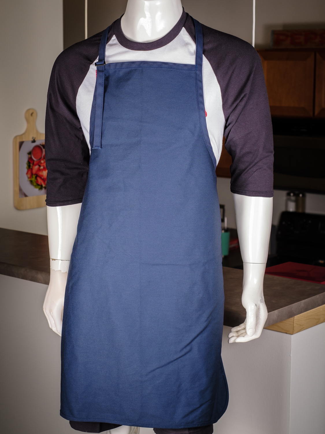 Brand new, never worn. Navy blue apron with no pockets on it.