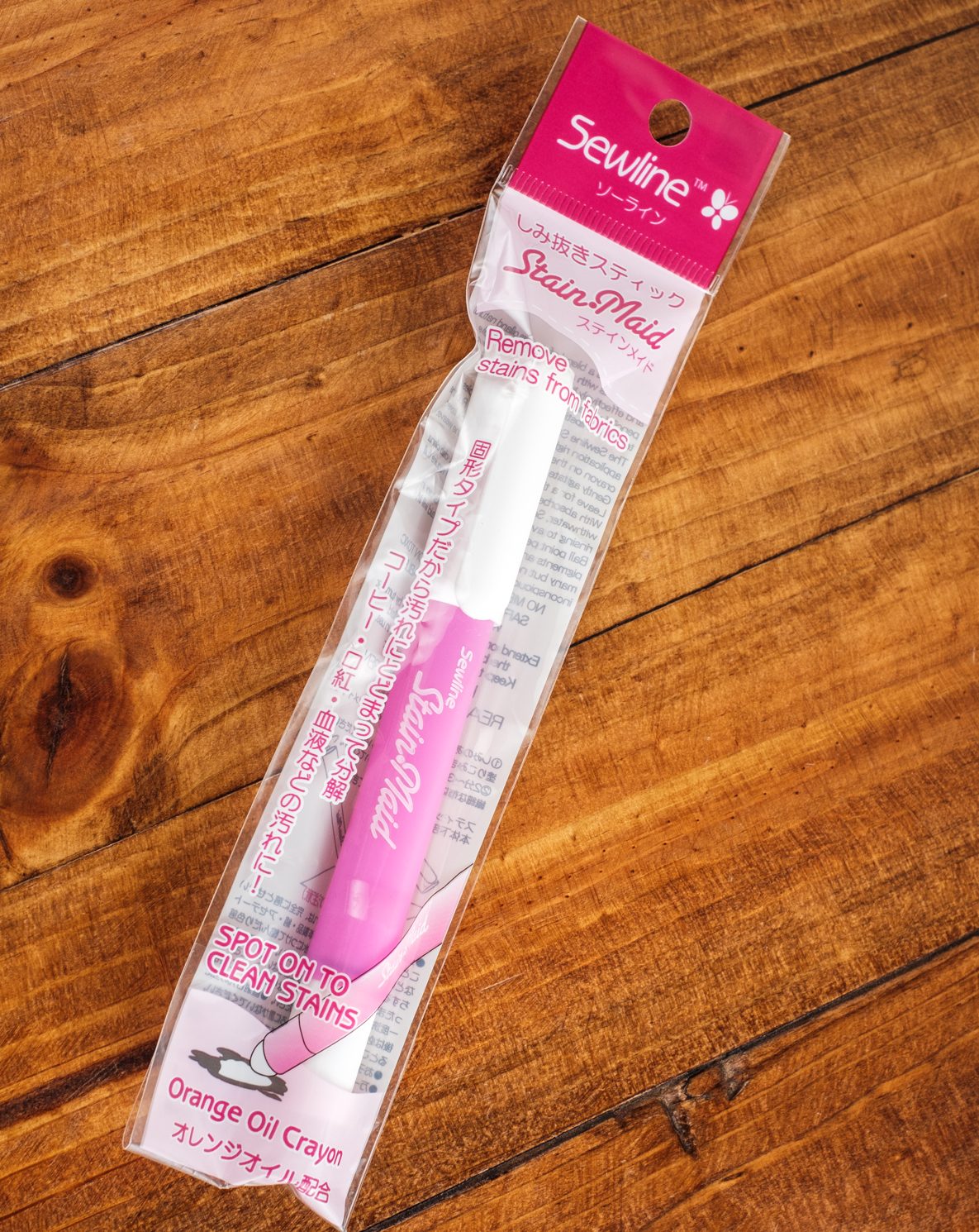 Stain Maid is a blend of orange oil and natural ingredients with a proven ability to dissolve and effectively lift oil-based stains grease inks pencil food and substances such as coffee tea, blood lipstick and ketchup. The Sewline Stain Maid crayon enable application right on the stain spot. No mess no spill non-toxic. Safe for all washables. Instructions included.